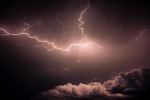A lightning bolt stretches across the sky illuminating all that is around it.