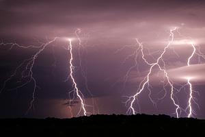 A prodigious thunderstorm rolls across the Midwest, illuminating the night sky.