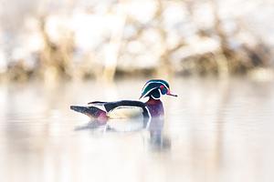 A beautiful drake Wood Duck swims on a lake during a foggy cold morning.